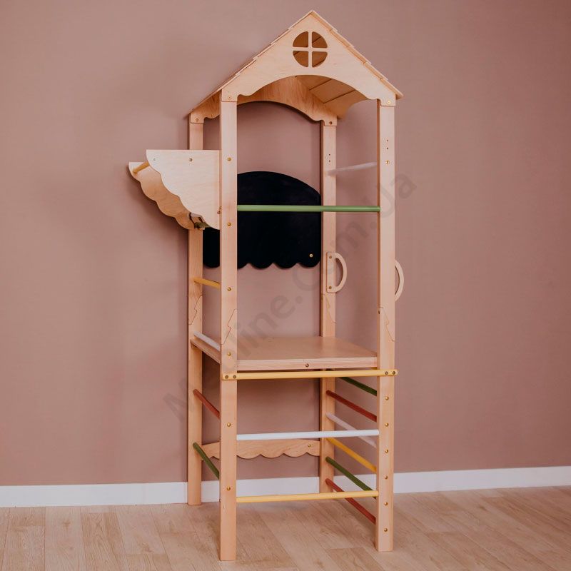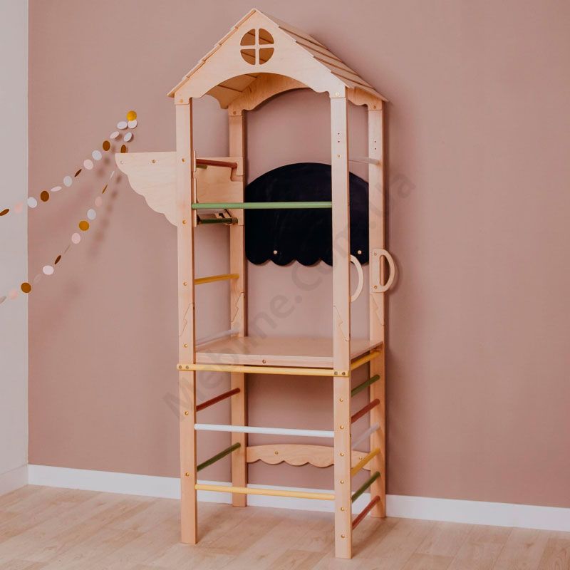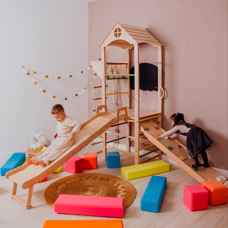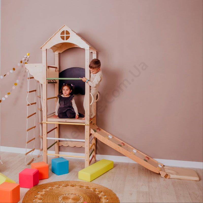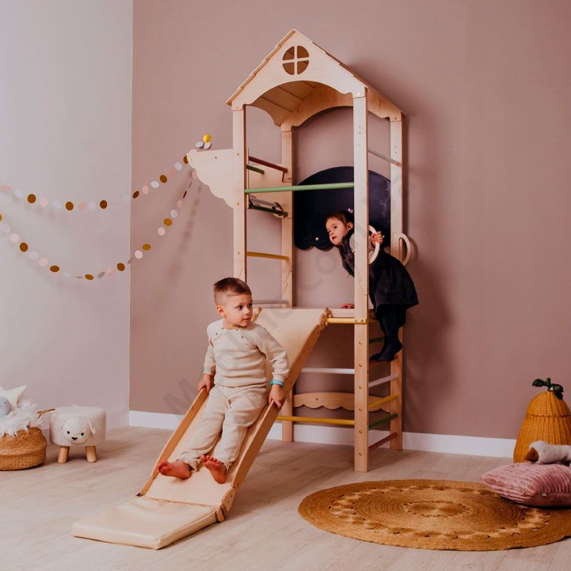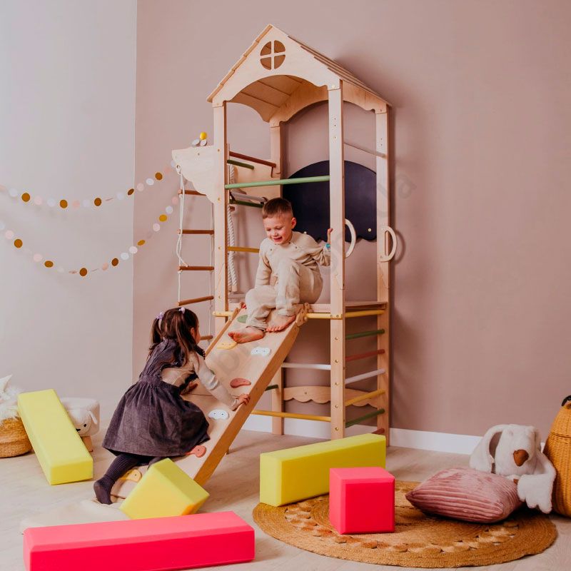 - Розвиває крупну моторику, силу, витривалість і координацію, сприяє самостійній грі за принципами Монтессорі, замінює домашній спортзал та ігрову зону.