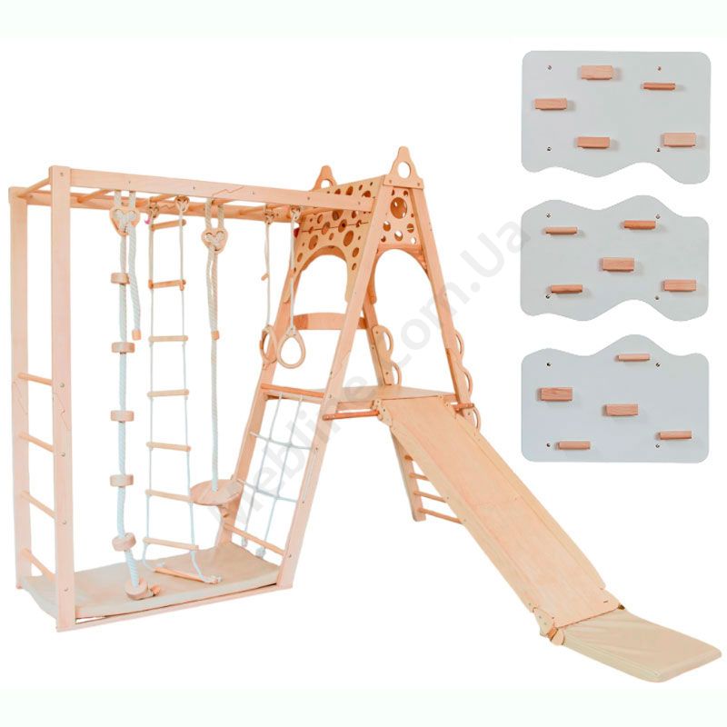 Дерев’яний ігровий майданчик з комплектом гімнастичних аксесуарів, двосторонньою гіркою та скеледромом.