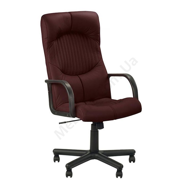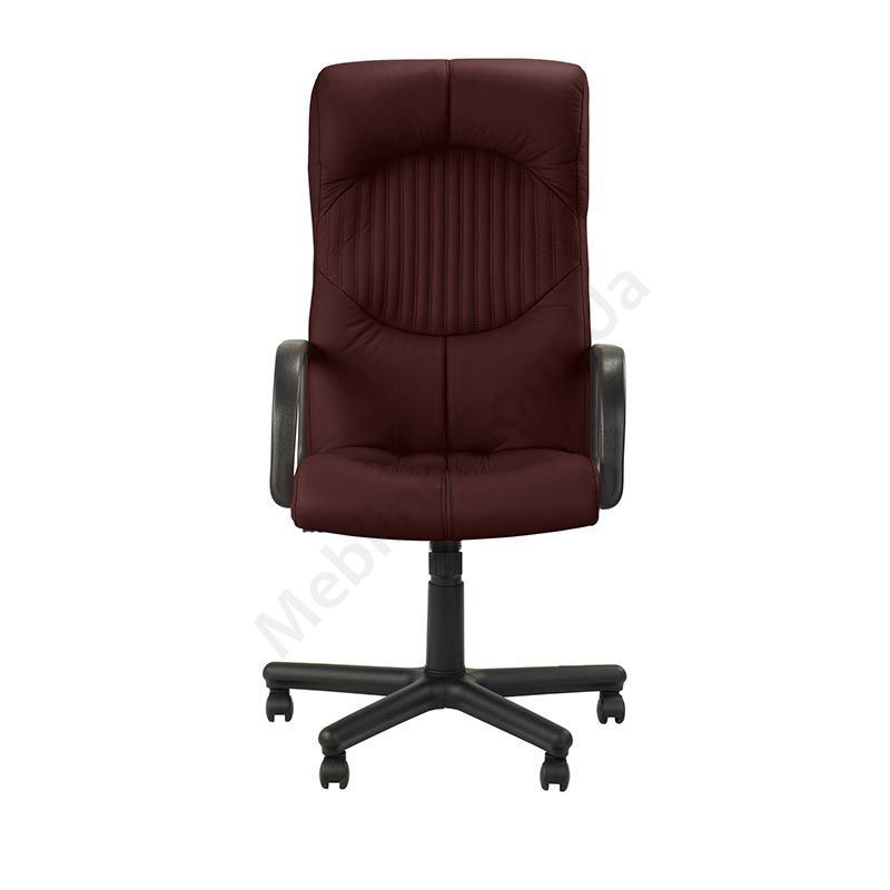 Крісло для керівника з вираженою підтримкою шиї та попереку, роздільним каркасом, фіксацією у вертикальному положенні, пластиковими підлокітниками, на металевій основі з пластиковими накладками.