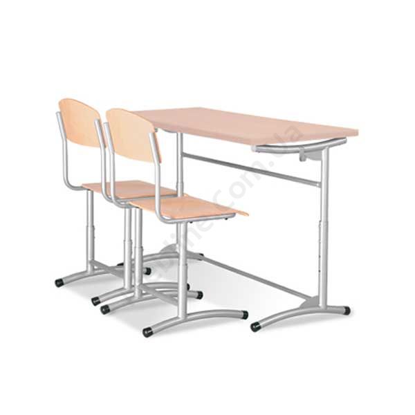 Двомісний учнівський стіл з регульованою висотою на алюмінієвій рамі.