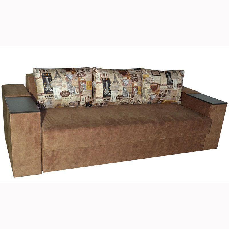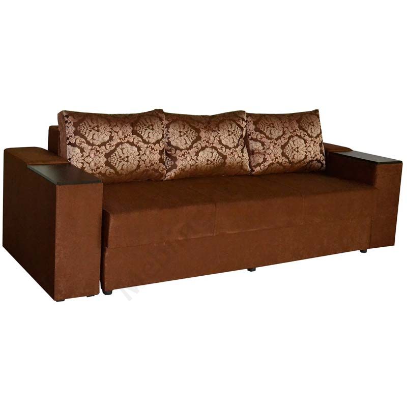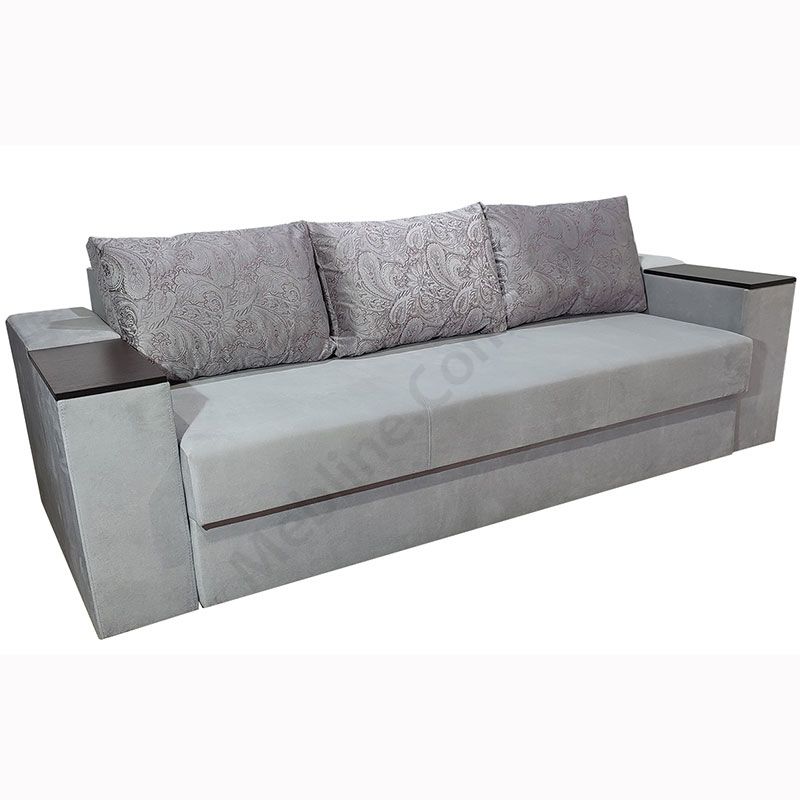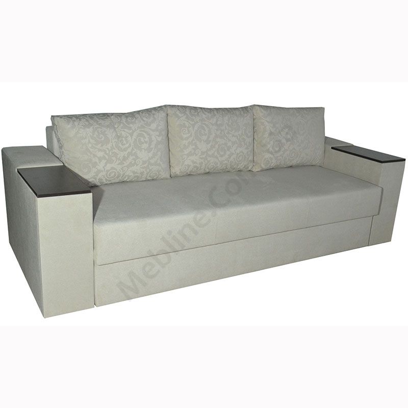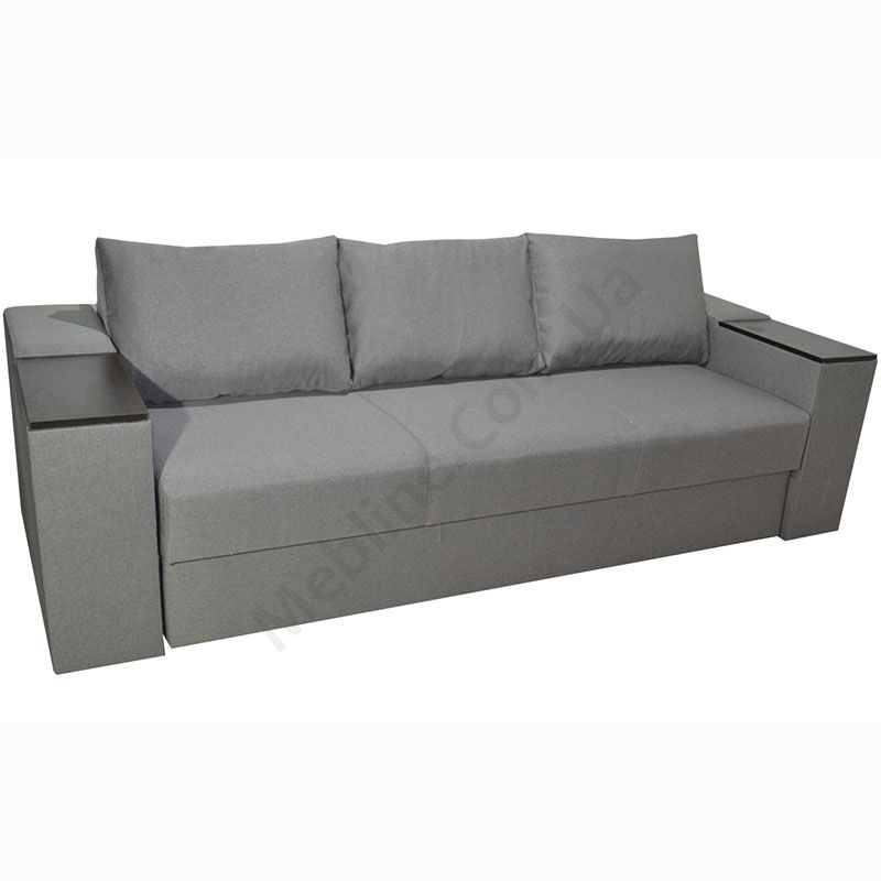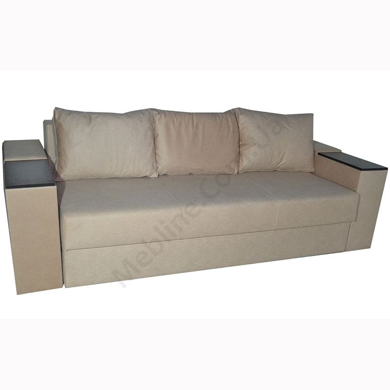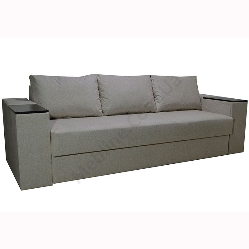 Розкладний диван з широкими підлокітниками з нішою та баром.