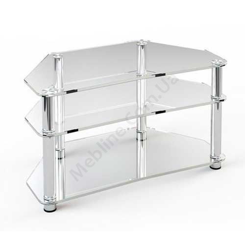 Скляна тумба під телевізор з відкритими полицями.