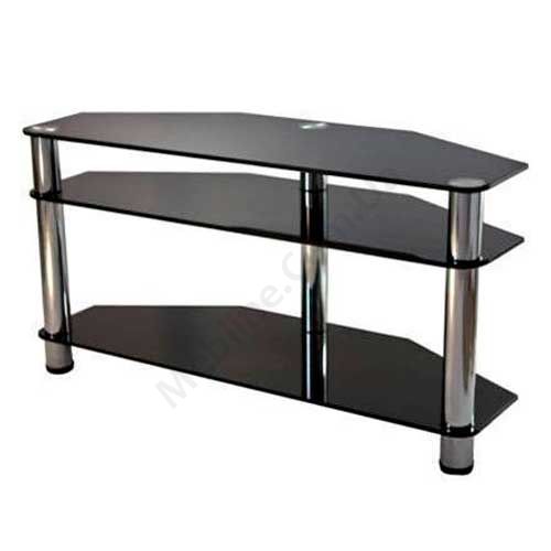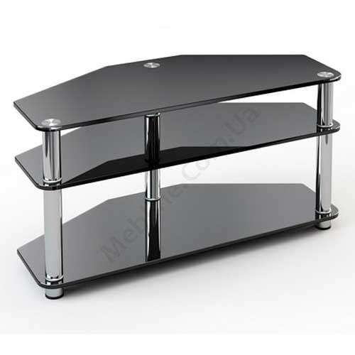 Скляна тумба під телевізор з відкритими полицями.