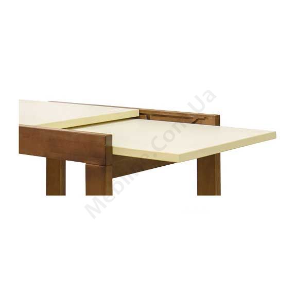 Розсувний обідній стіл із прямими ніжками з натурального дерева.