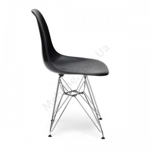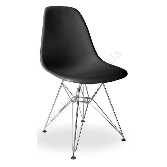 Міцний пластиковий дизайнерський стілець на металевих ніжках без підлокітників, чорного кольору.