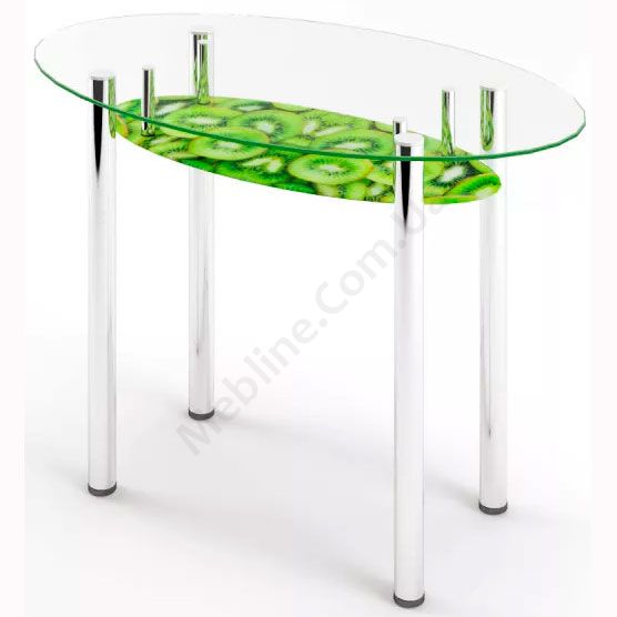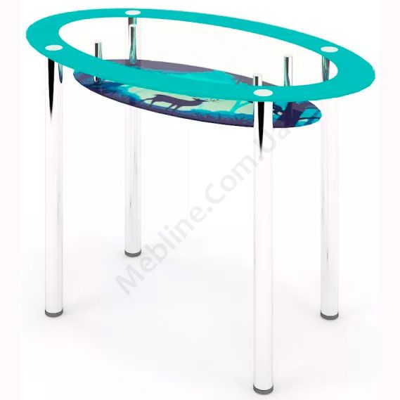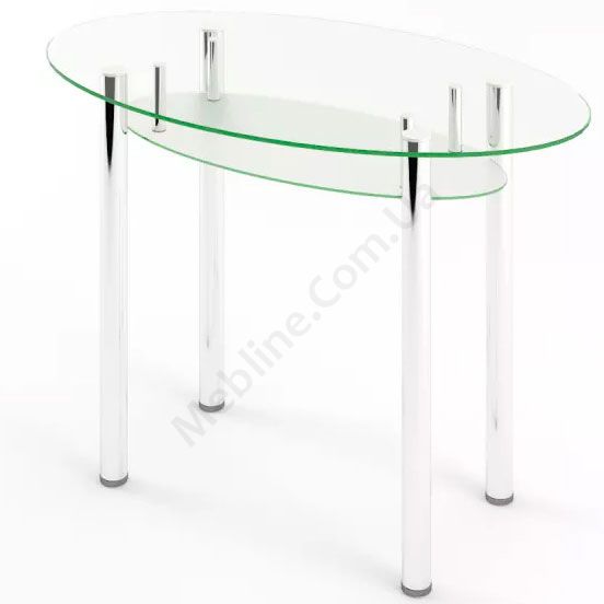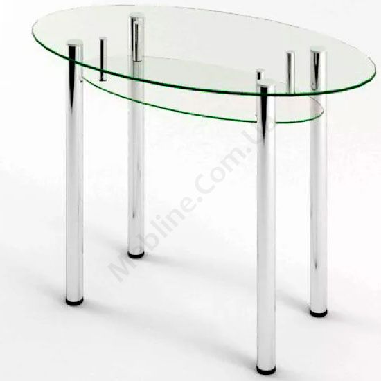 Овальний скляний обідній стіл на металевих ніжках з поличкою.