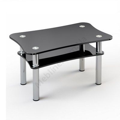 Фігурний журнальний стіл зі скляною стільницею та полицею.
