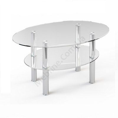 Овальний журнальний стіл зі скляною стільницею та полицею.