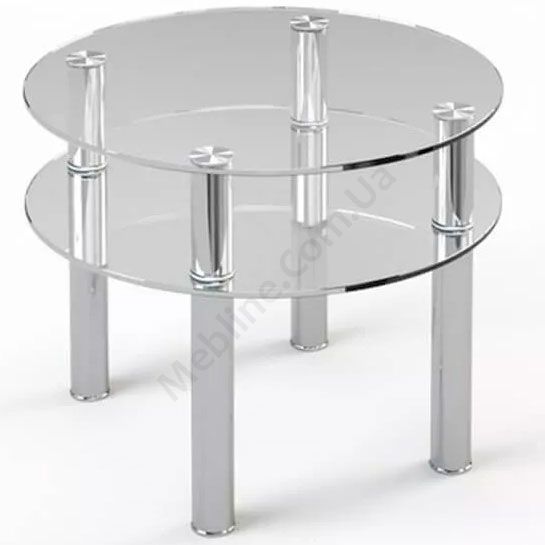 Круглий журнальний стіл зі скляною стільницею та полицею.
