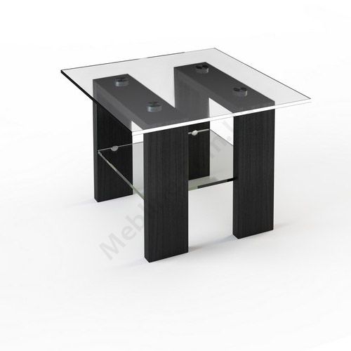 Квадратний журнальний стіл зі скляною стільницею та полицею.
