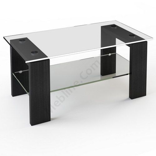Прямокутний журнальний стіл зі скляною стільницею та полицею.