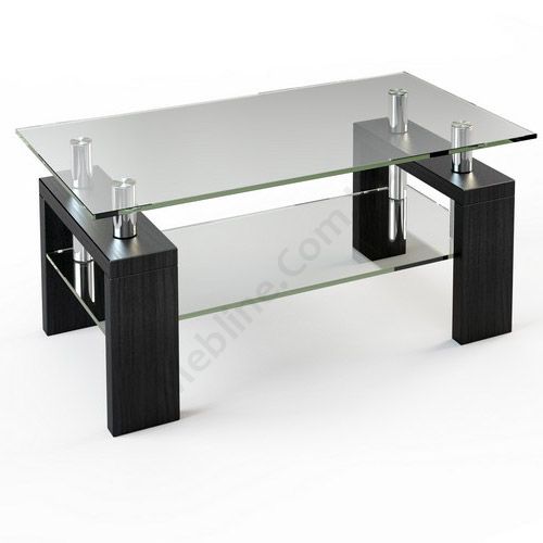 Прямокутний журнальний стіл зі скляною стільницею та полицею.
