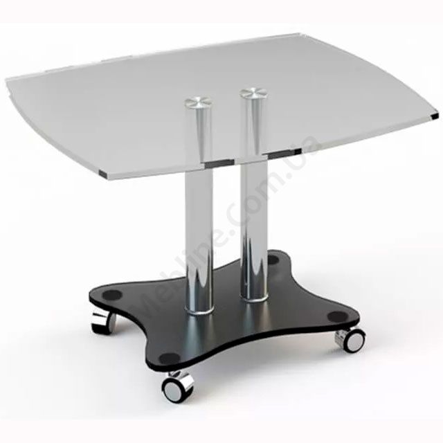 Журнальний стіл на роликах зі скляною стільницею та полицею.