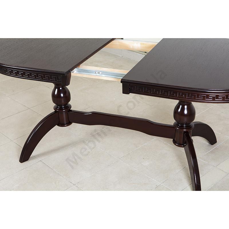 Розкладний обідній стіл овальної форми з натурального дерева на фігурних ніжках.