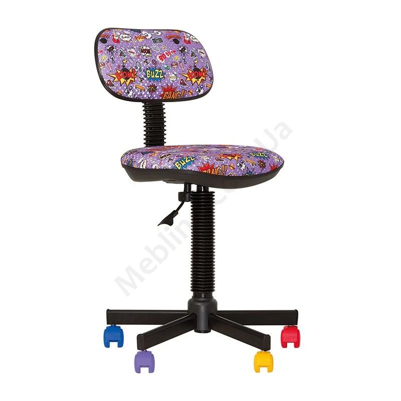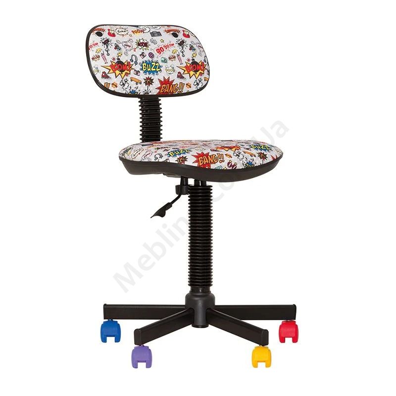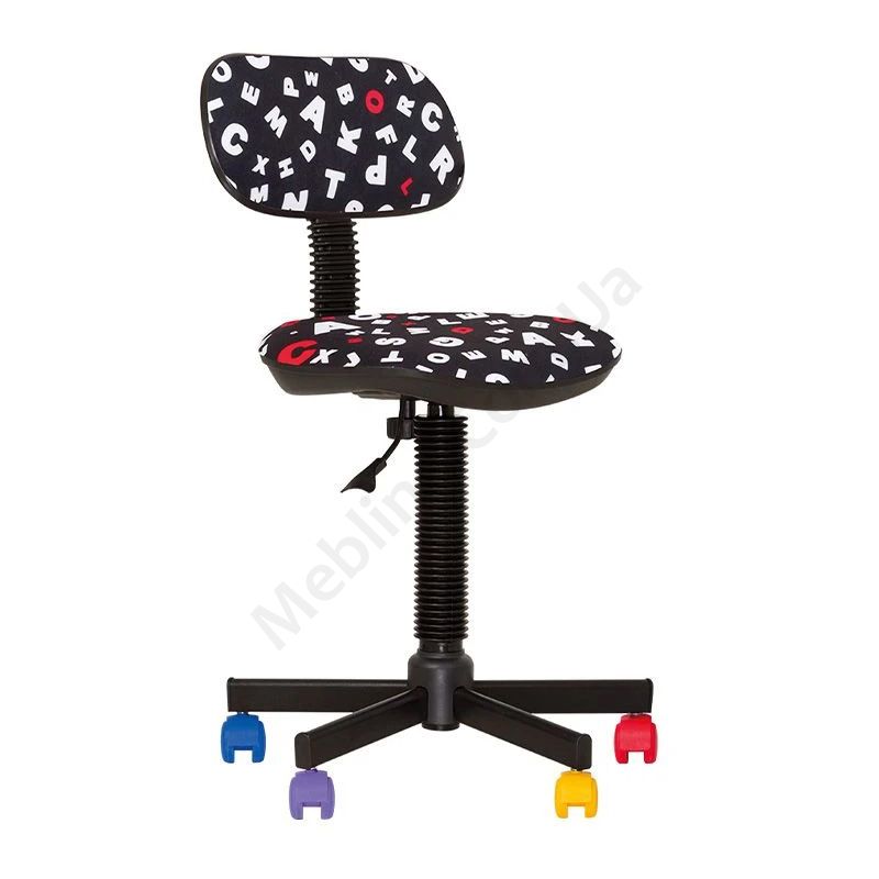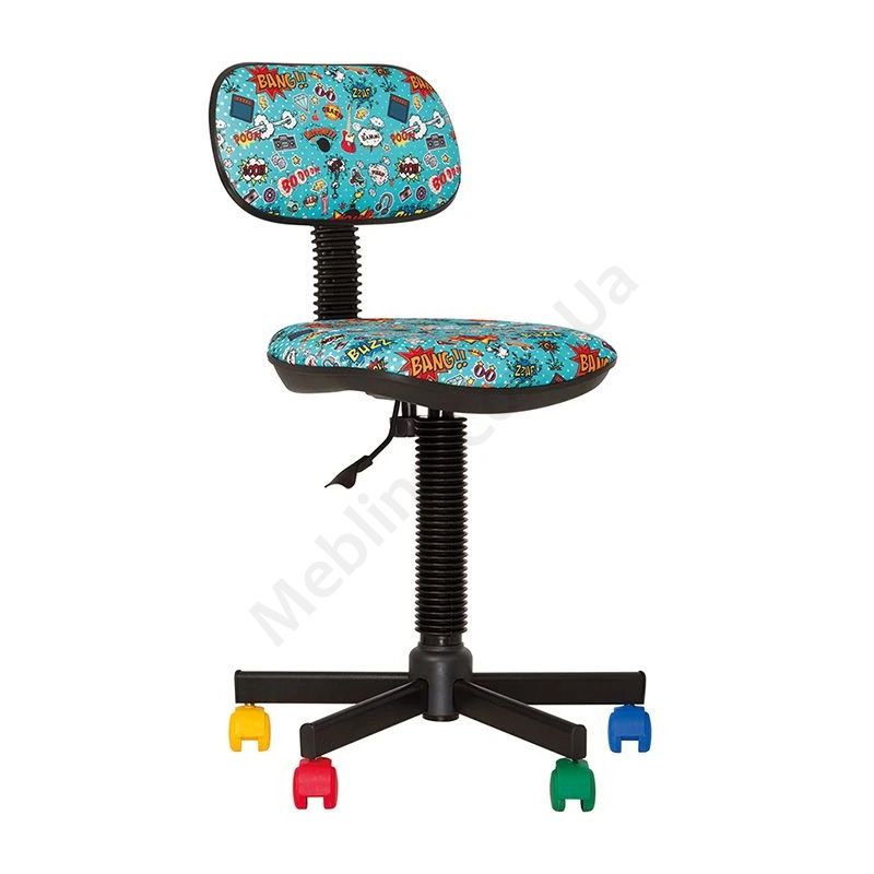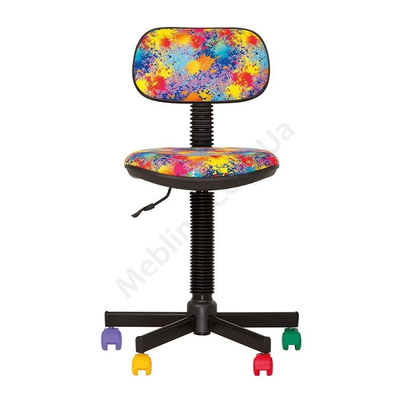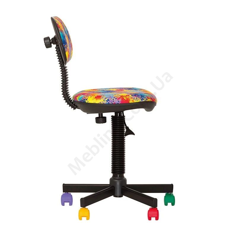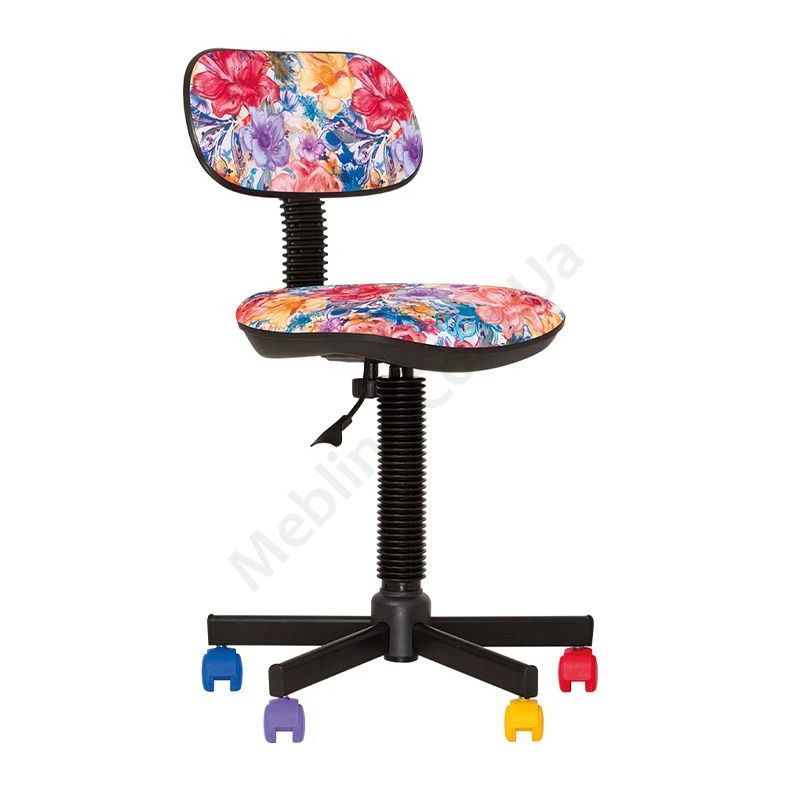 Дитяче поворотне крісло з низькою спинкою, кольоровими роликами на металевій основі.