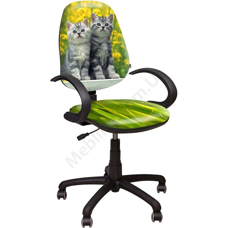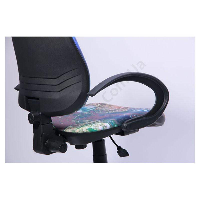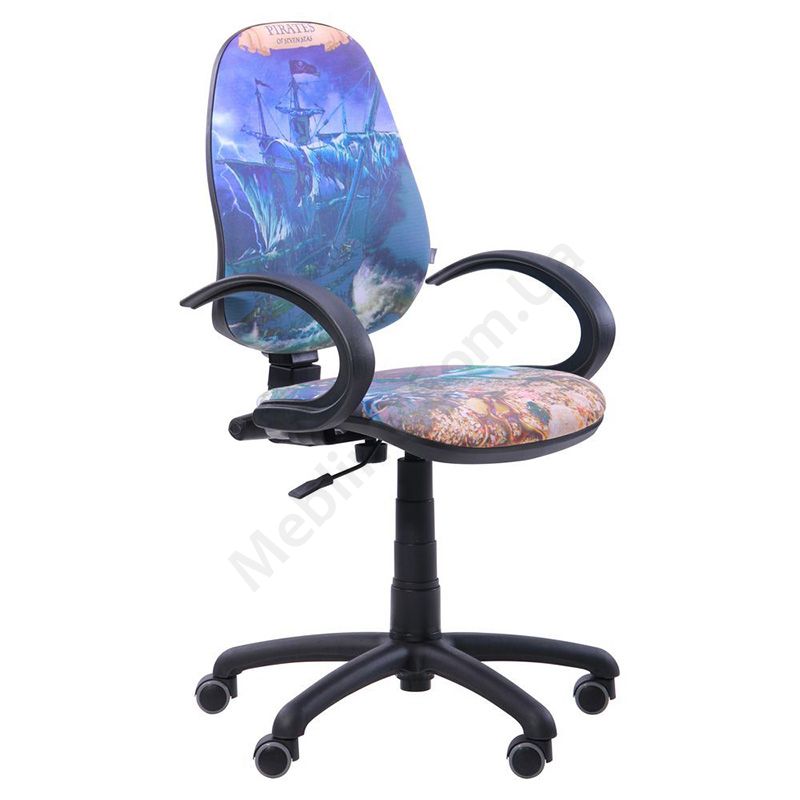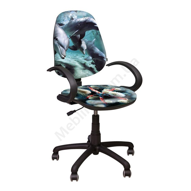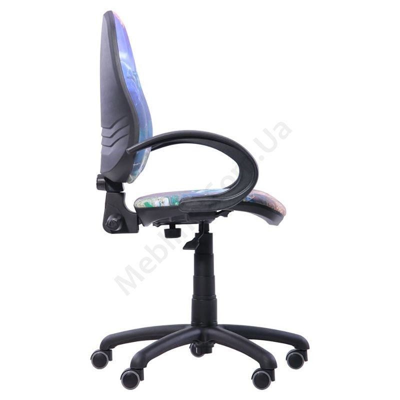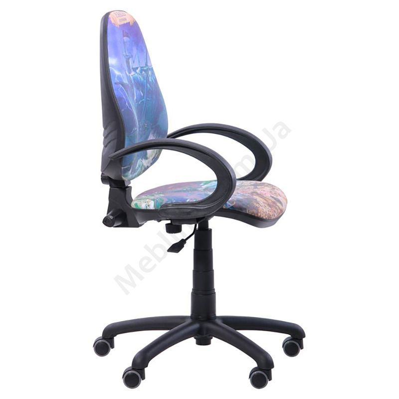 Поворотне крісло з принтованим сидінням і спинкою, нерегульованими підлокітниками, на пластиковій основі.