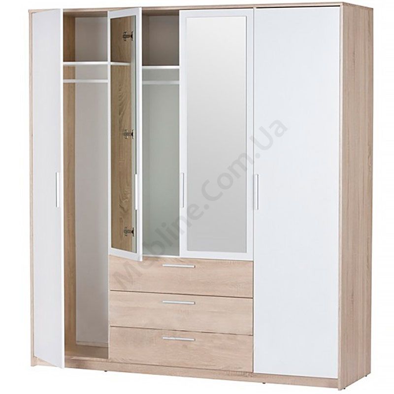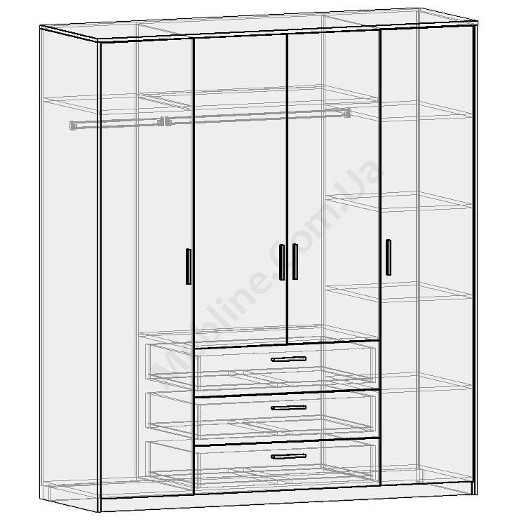 Чотиридверна шафа зі штангою для одягу, поличками та дзеркалами.