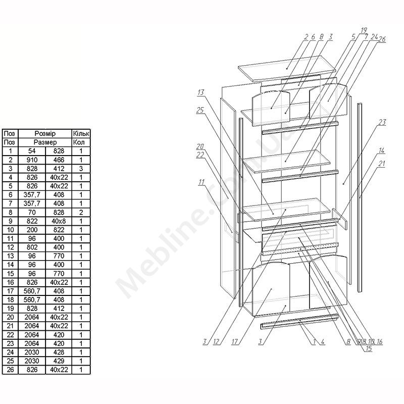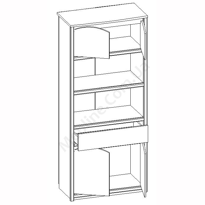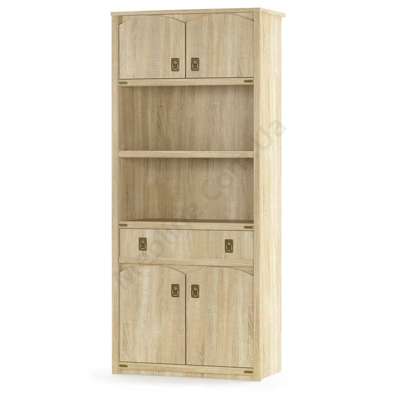 Книжкова шафа з дверцятами зверху та знизу, висувною шухлядою та відкритими полицями.