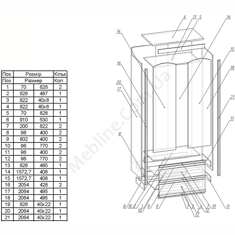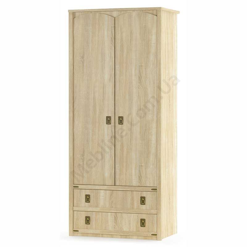 Дводверна розпашна шафа з двома висувними шухлядами, штангою для одягу та поличкою.