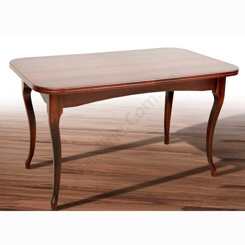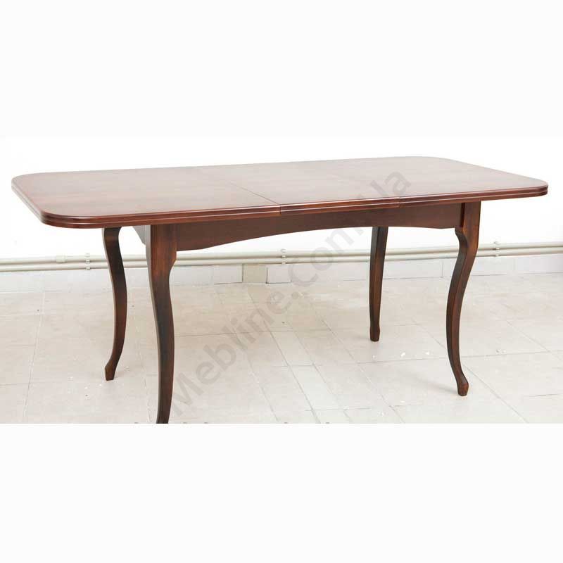 Розкладний обідній стіл із натурального дерева з закругленими кутами та вигнутими ніжками.