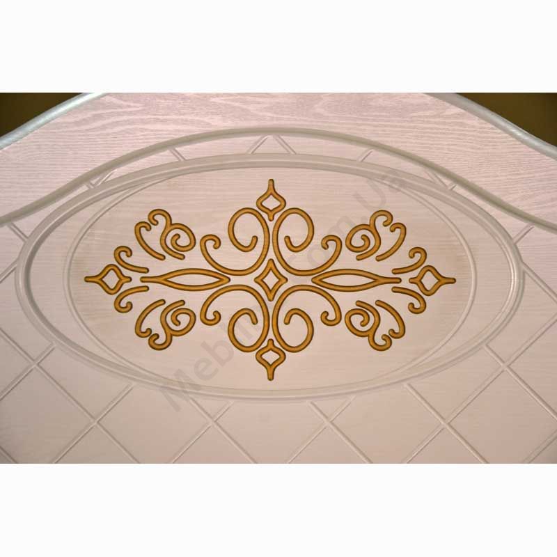 Двоспальне ліжко з фігурним узголів’ям та узніжжям та візерунком з золотої патини на фасаді.