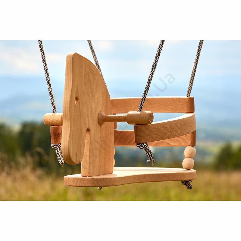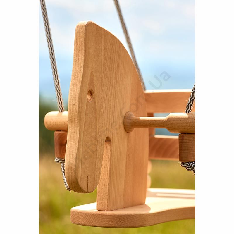 Підвісна дерев’яна гойдалка конячка зі спинкою та ручками.