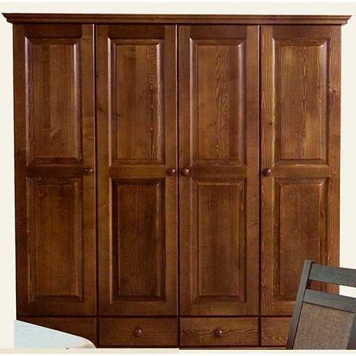 Чотиридверна дерев’яна шафа з чотирма висувними шухлядами, штангою для одягу та поличками.