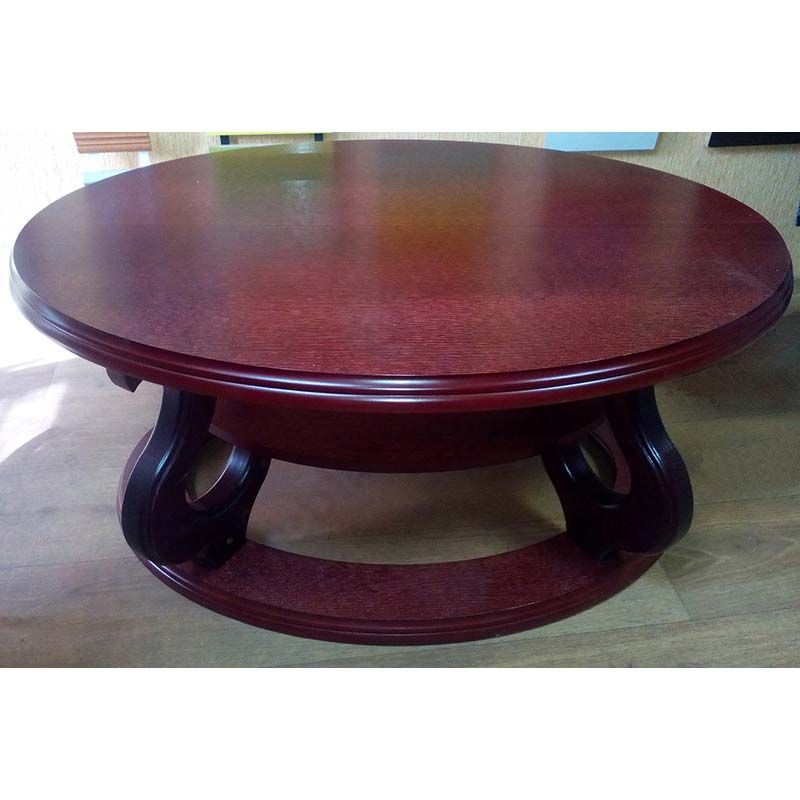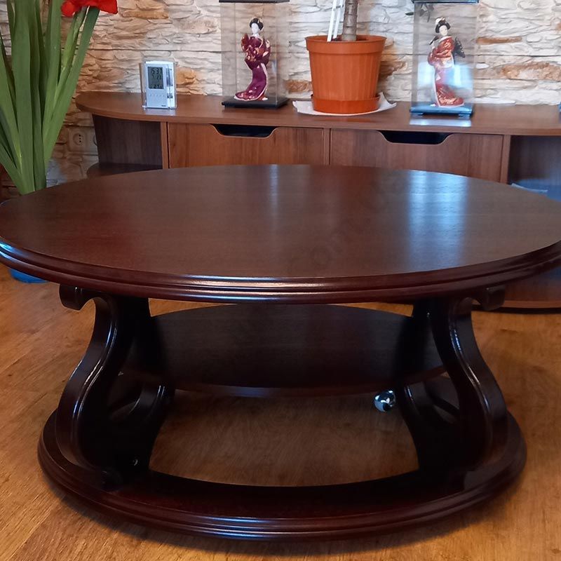 Овальний журнальний стіл з натурального дерева на фігурних ніжках.