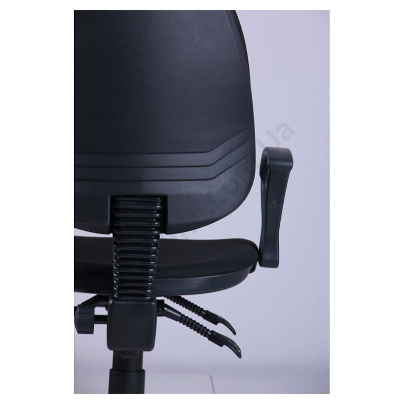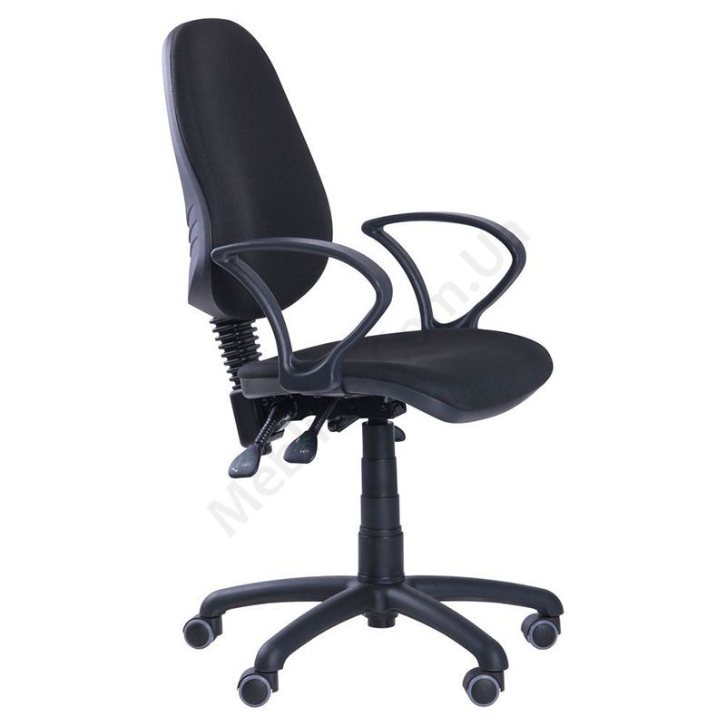 Поворотне крісло з нерегульованими підлокітниками, незалежним регулюванням сидіння та спинки на пластиковій основі.