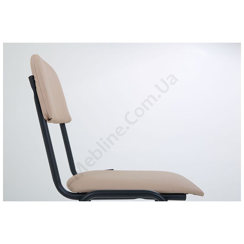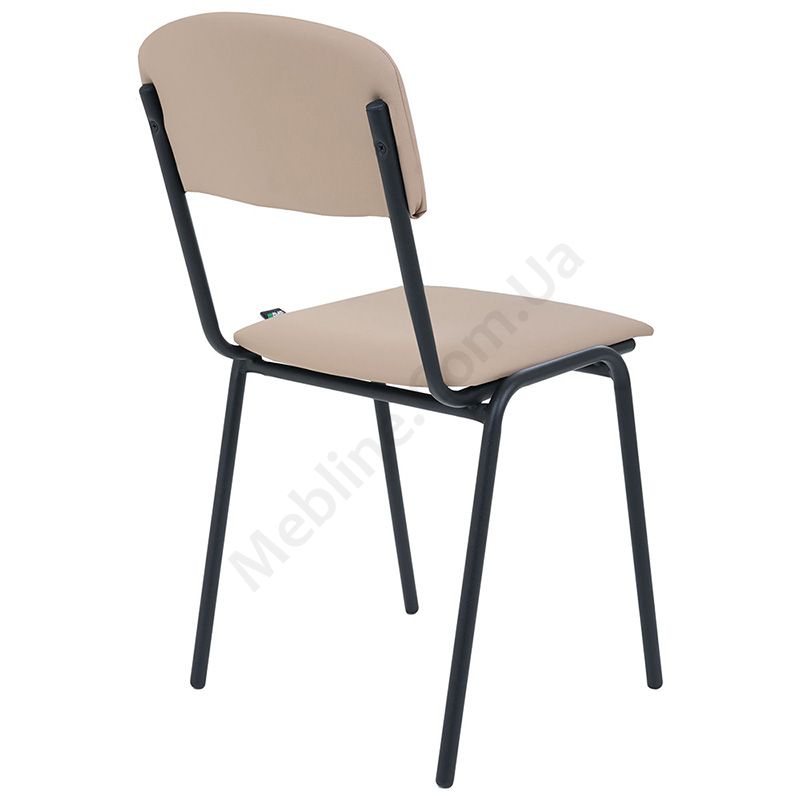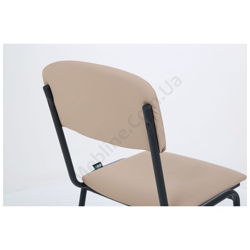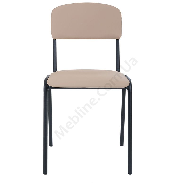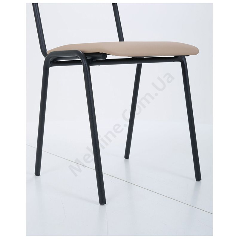 Стілець на чорному металевому каркасі з м’якою оббивкою сидіння та спинки.