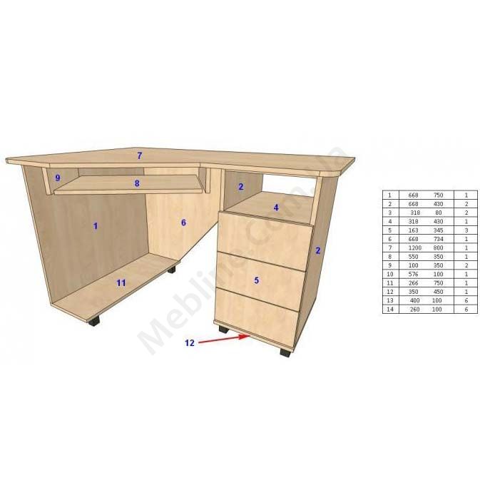 Угловой компьютерный стол с полкой под системный блок и выдвижными ящиками.