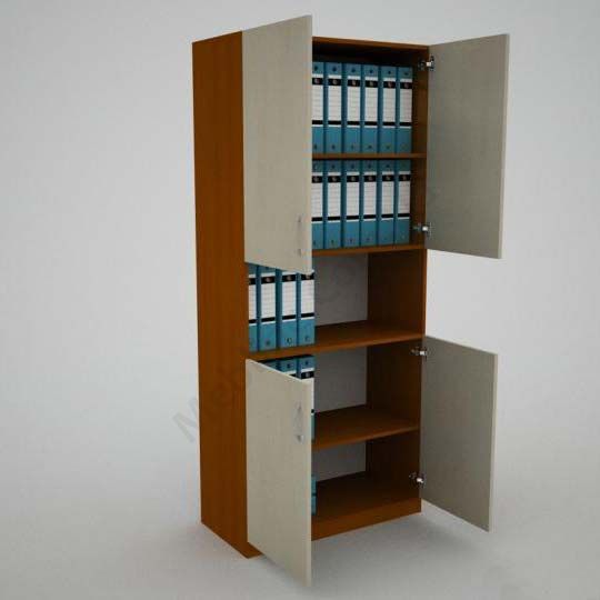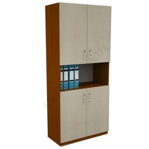 Дві верхні та дві нижні полиці закриті дверцятами.Матеріал — ламінована ДСП Swisspan, завтовшки 16 мм.Екологічна безпека класу Е-1.ДСП має високу щільність.Фурнітура — DC та Linken.Протиударна кромка — ПВХ, завтовшки 2 та 0.5 мм.