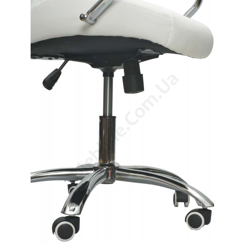 Біле офісне крісло на коліщатках з механізмом хитання та регулюванням висоти.