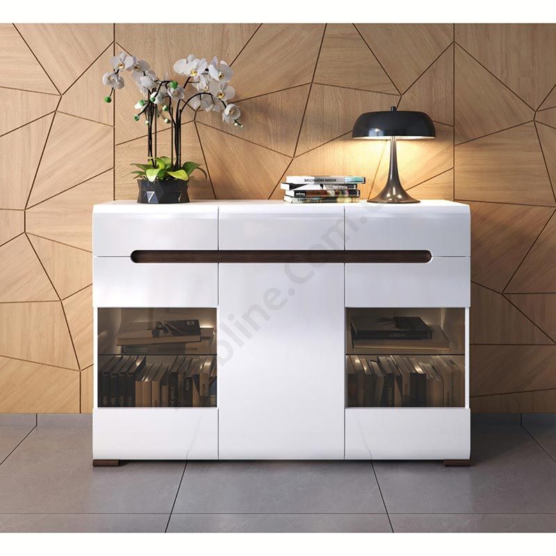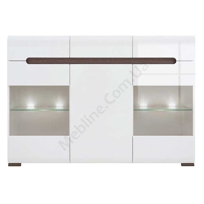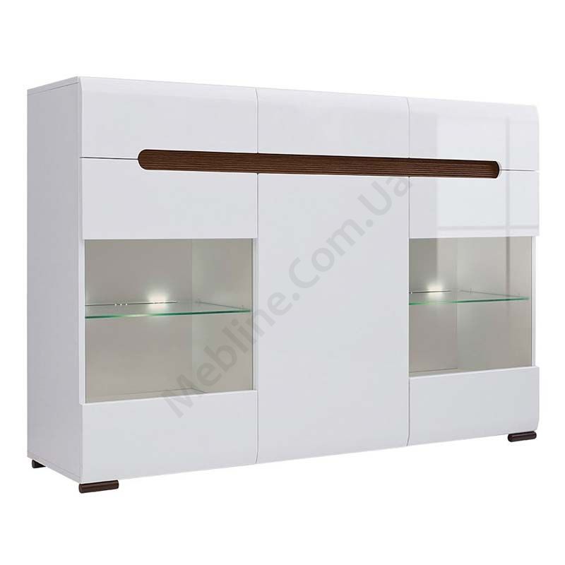 Тумба з трьома висувними шухлядами, двома скляними дверцятами та підсвічуванням.