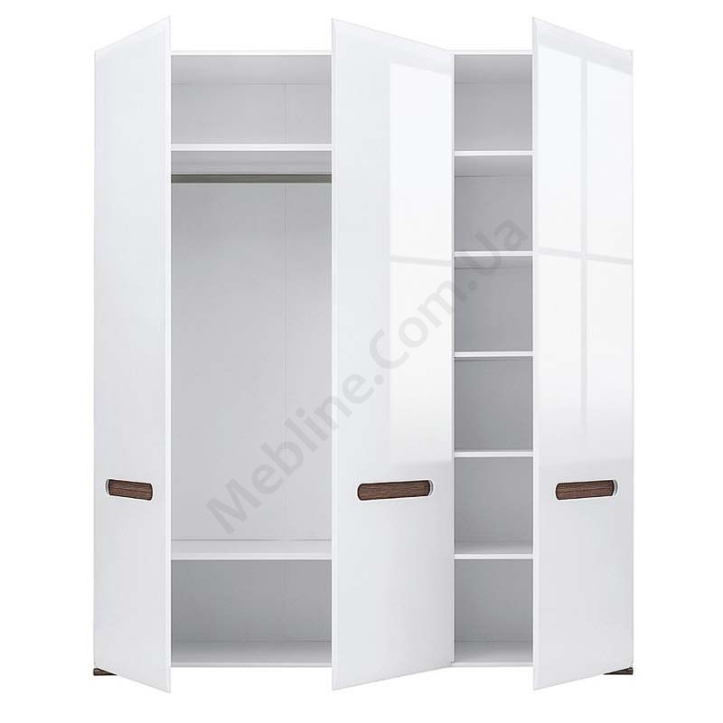 Тридверна шафа зі штангою для одягу та полицями всередині.