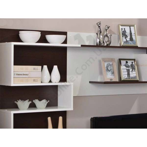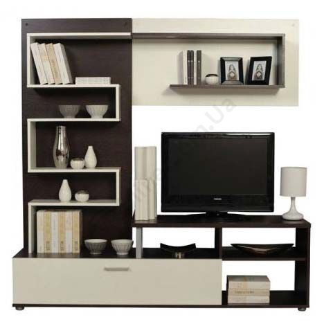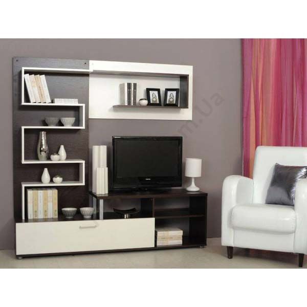 Стінка з тумбою під телевізор та зигзагоподібними полицями.