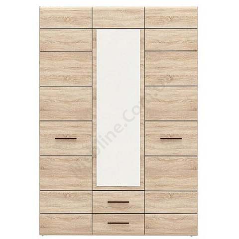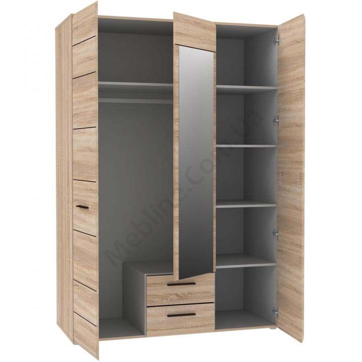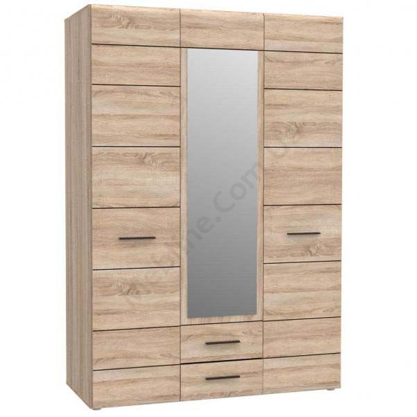 Тридверна шафа з дзеркалом, висувними шухлядами та штангою для одягу.