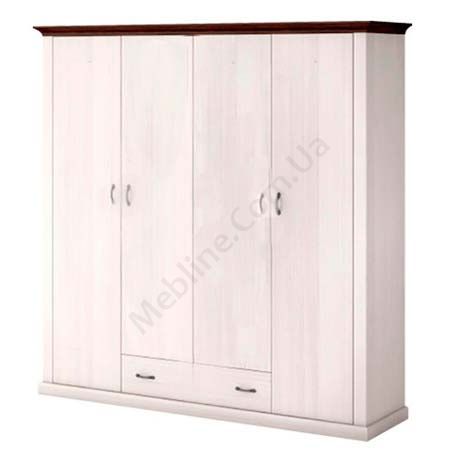 Чотиридверна шафа з висувною шухлядою, полицями та штангою для одягу.