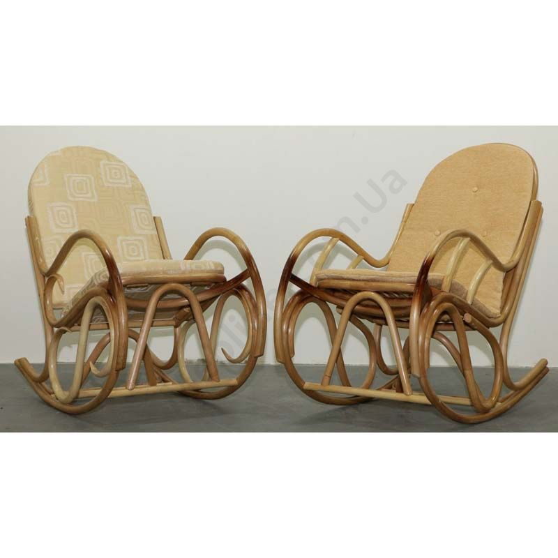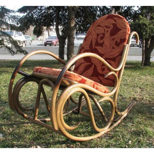 Крісло-гойдалка з ротанга з підлокітниками, м’якими подушками та ручками сзади.