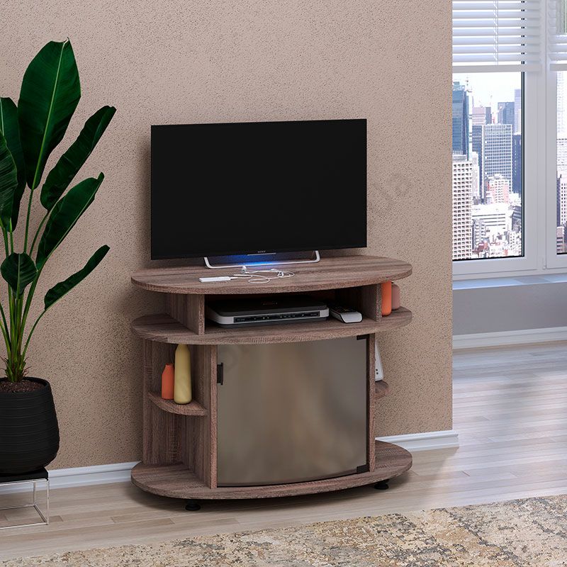 Тумба під телевізор зі скляними дверцятами та відкритими полицями.