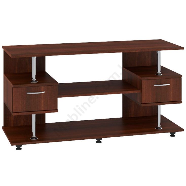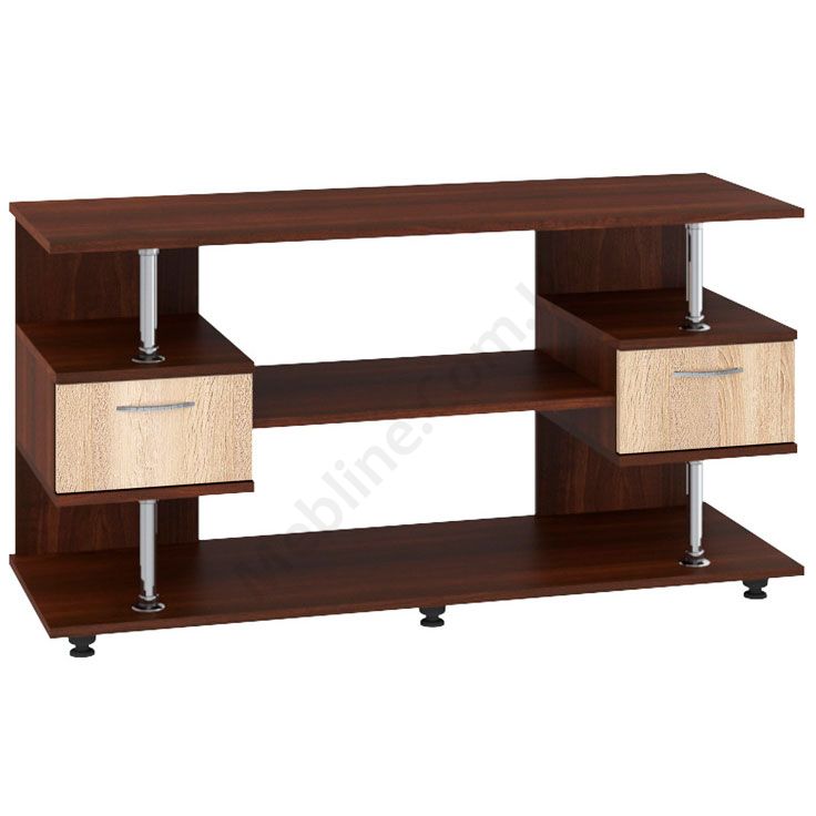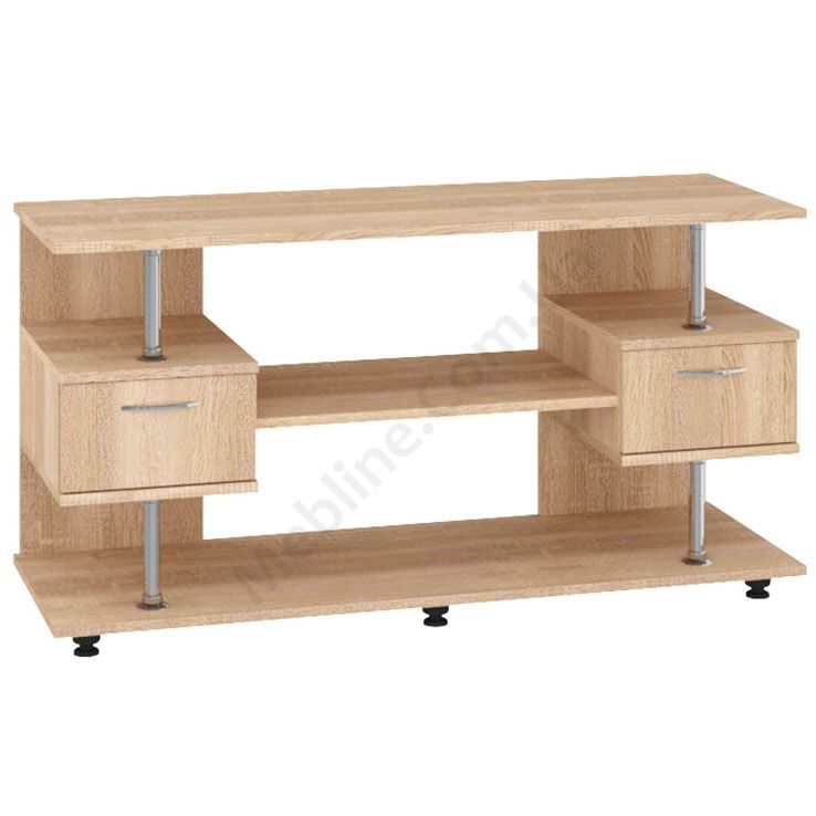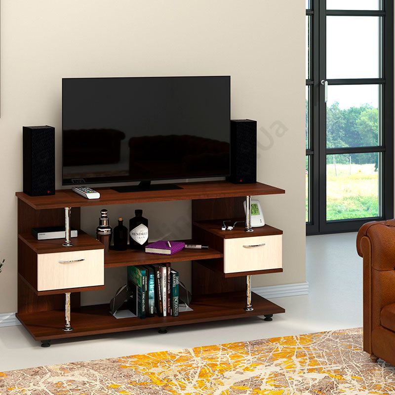 Тумба під телевізор з двома висувними шухлядами та відкритими полицями.