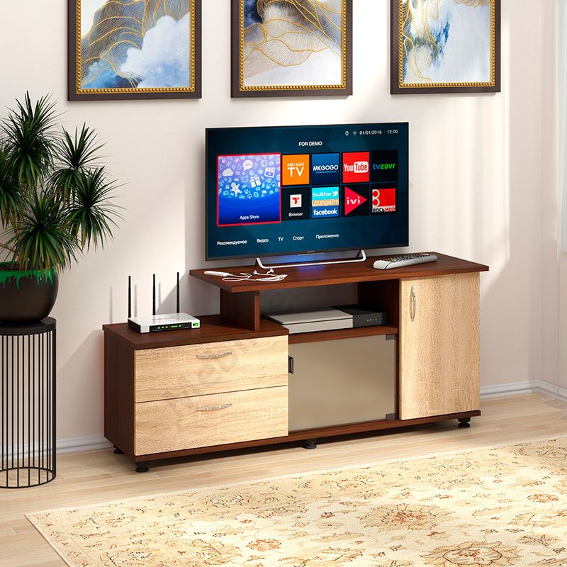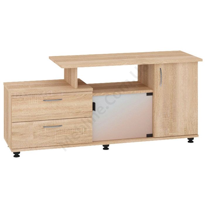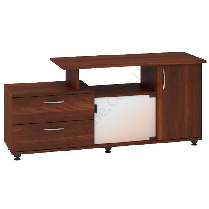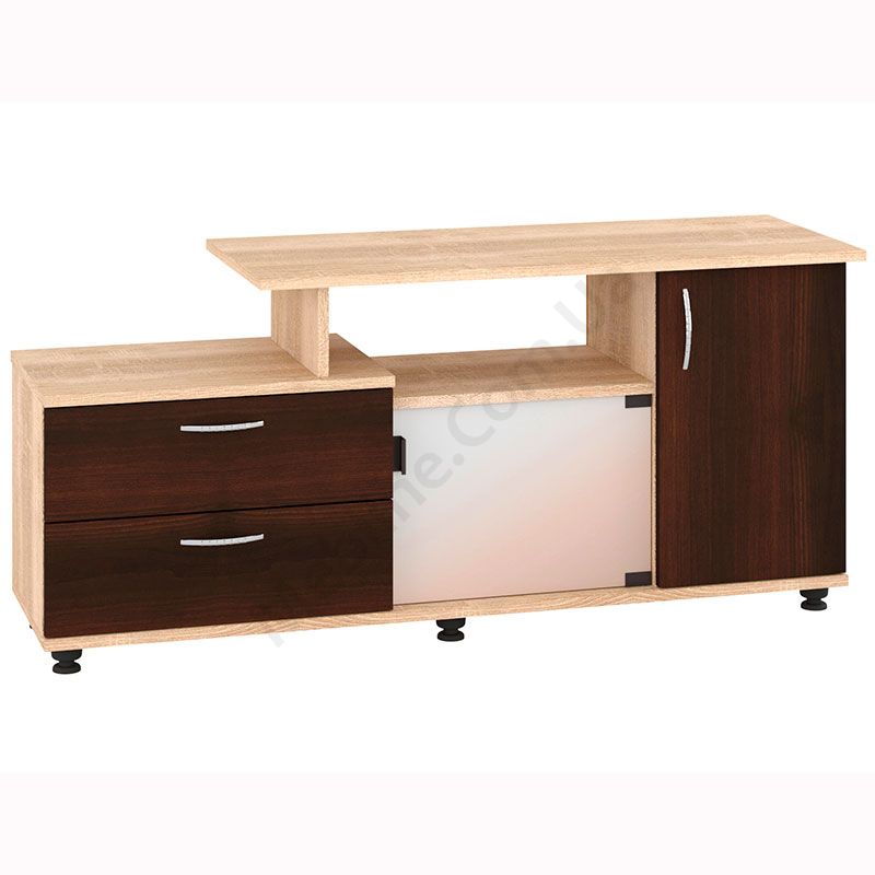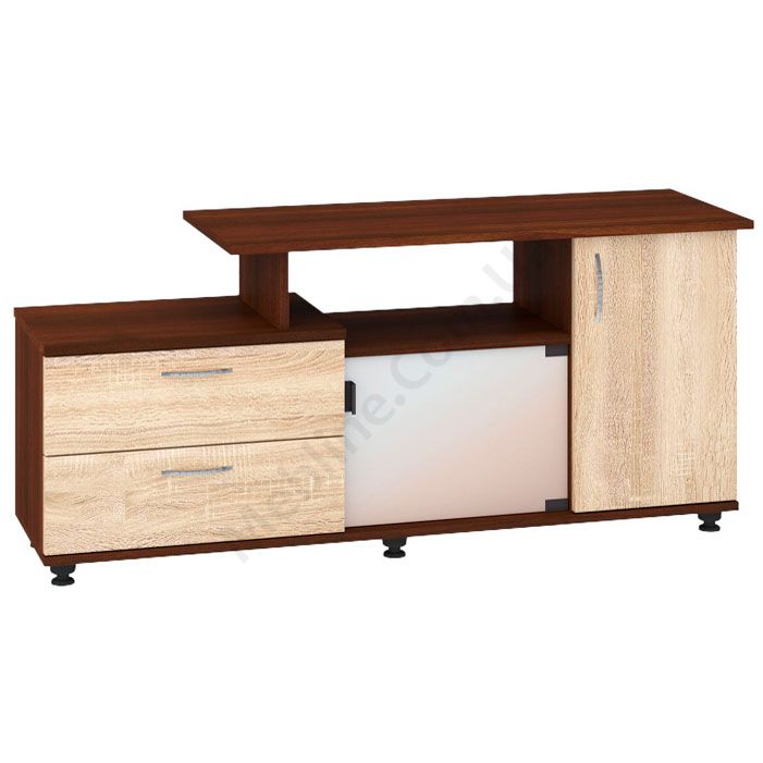 Тумба під телевізор з двома висувними шухлядами, скляними дверцятами і полицями.