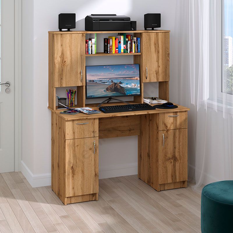 Комп’ютерний стіл з надставкою і двома тумбами.