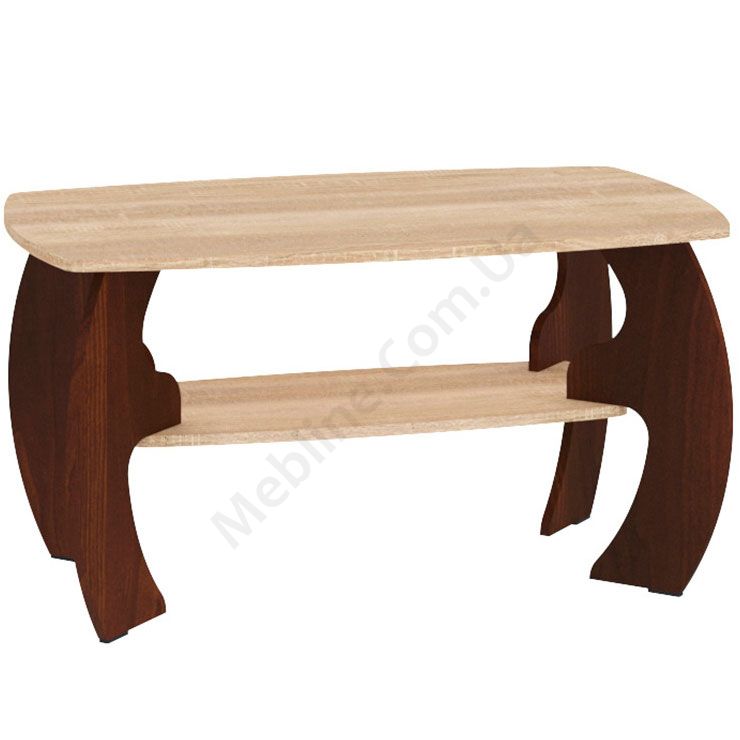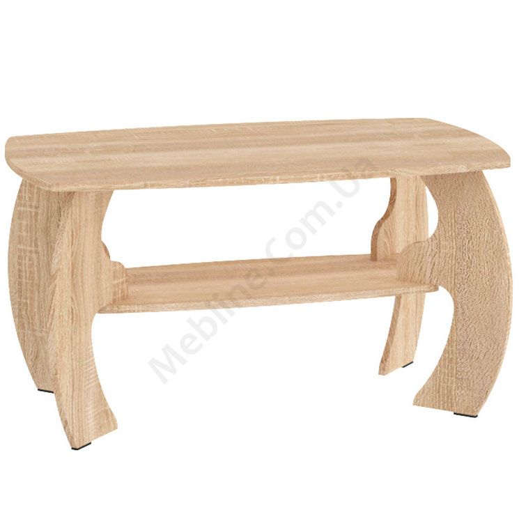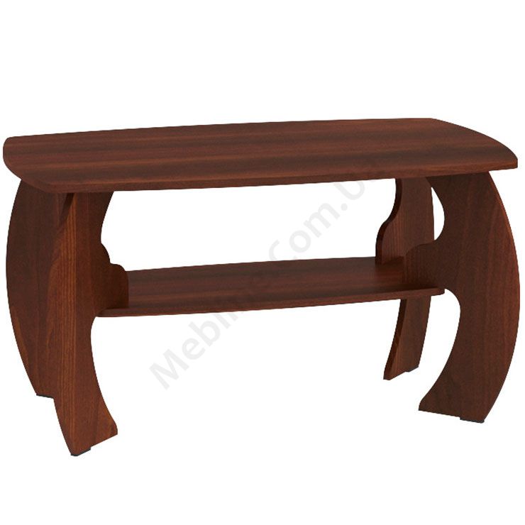 Прямокутний журнальний стіл з вигнутими ніжками і полицею.