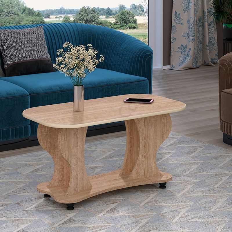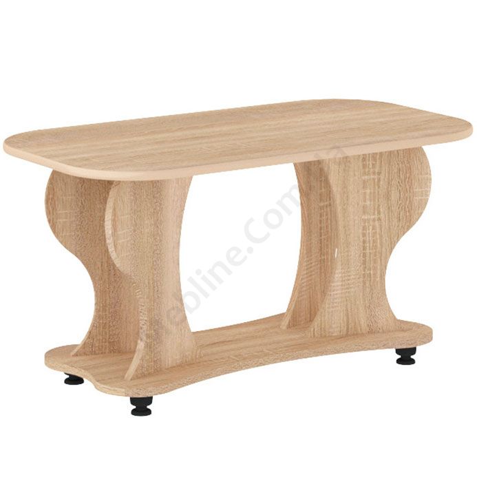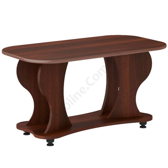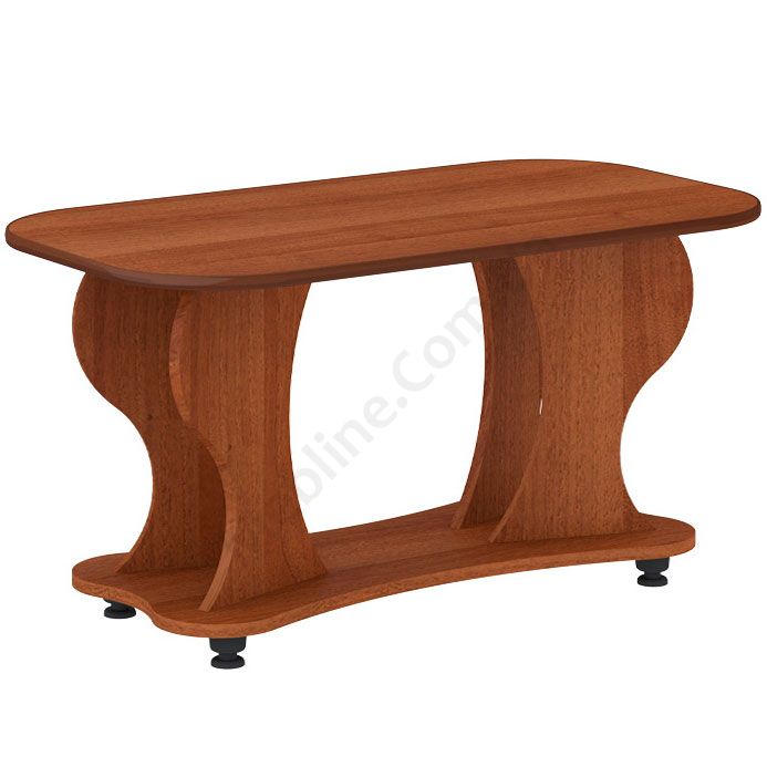 Прямокутний журнальний стіл з вигнутими опорами і полицею.