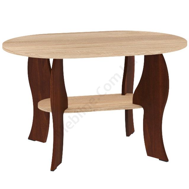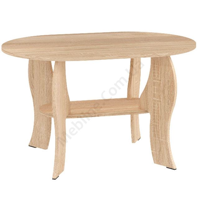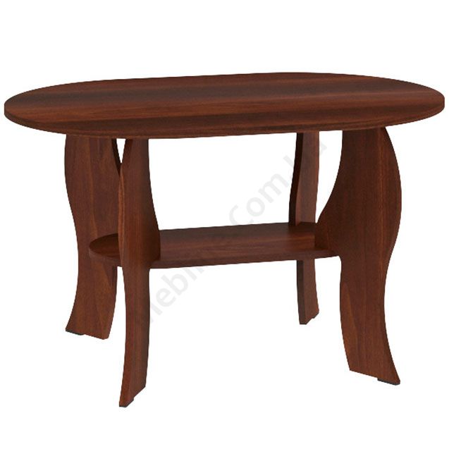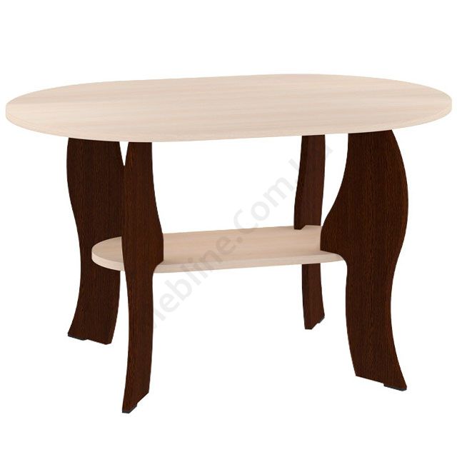 Овальний журнальний стіл з вигнутими ніжками і полицею.