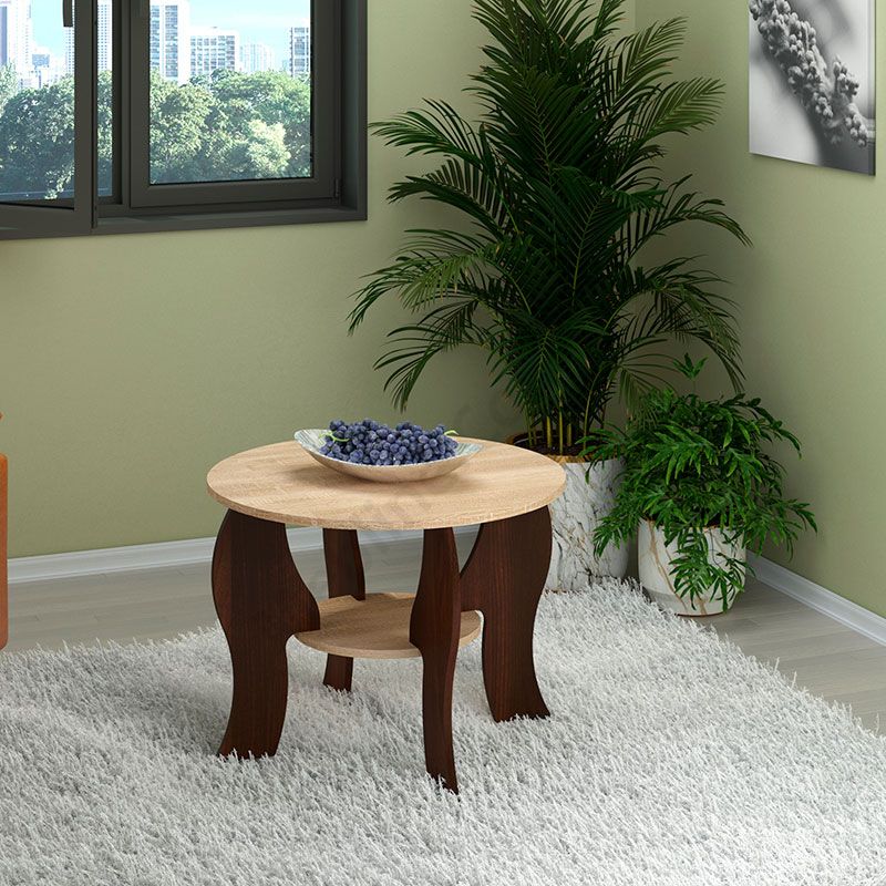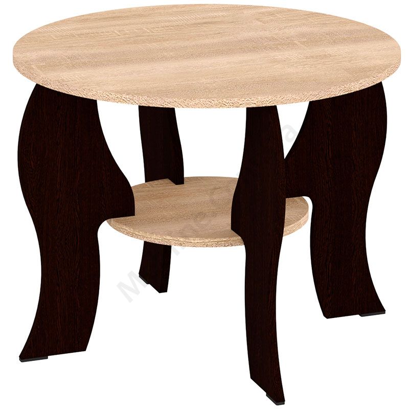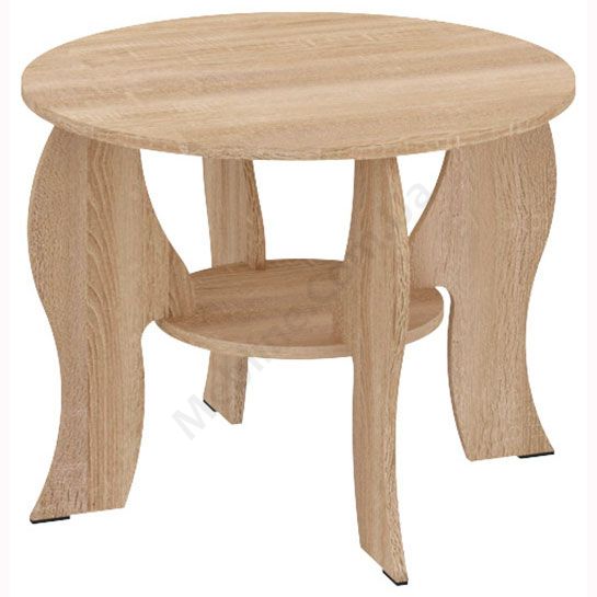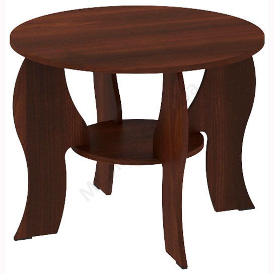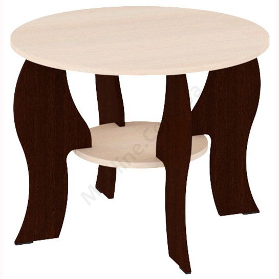 Круглий журнальний стіл з вигнутими ніжками і полицею.
