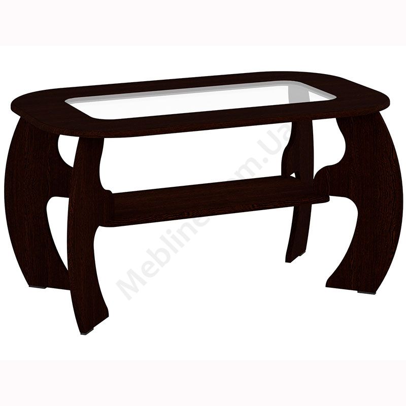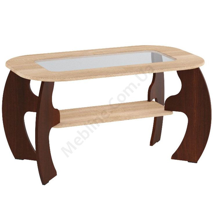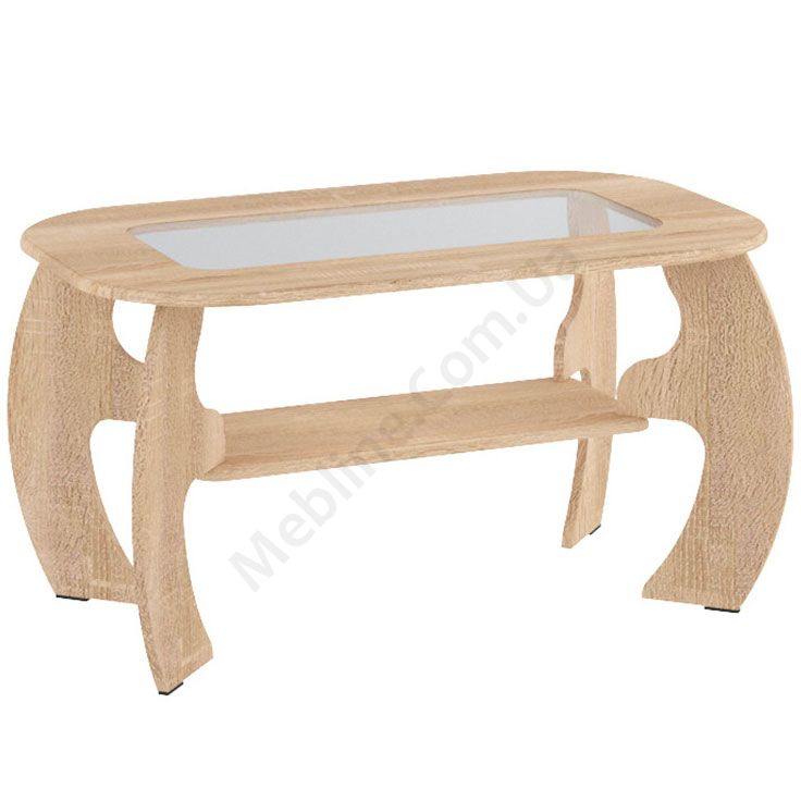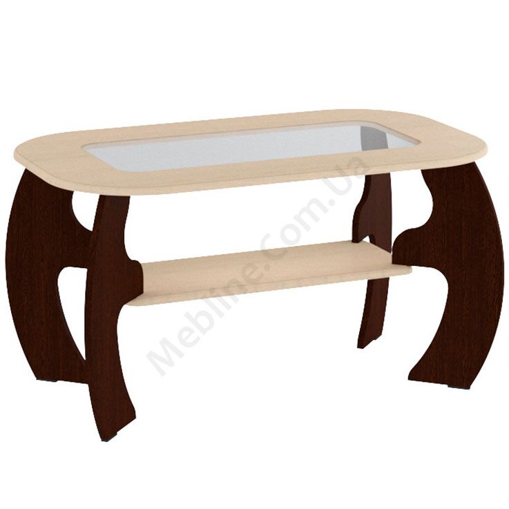 Прямокутний журнальний стіл зі скляною стільницею і полицею.