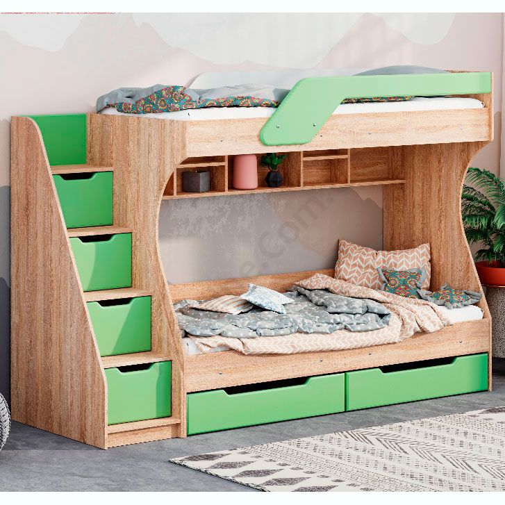 Дитяче двох’ярусне ліжко з драбинкою, полицями і шухлядами.