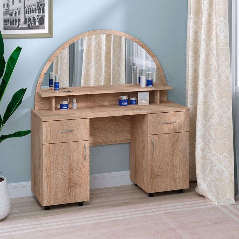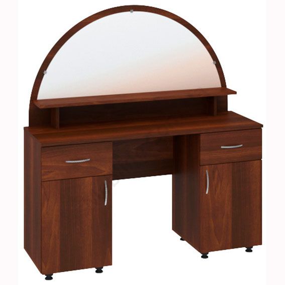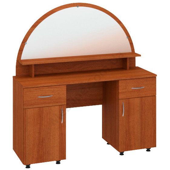 Туалетний столик з дзеркалом, тумбами і висувними шухлядами.